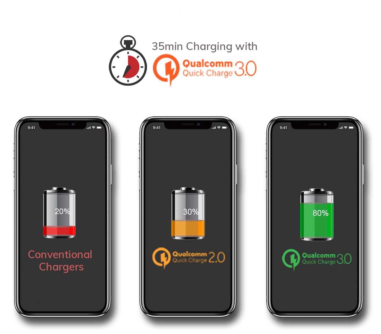 Can charge 4 times more faster than the conventional chargers & 40% faster than Qualcomm Quick charge 2.0