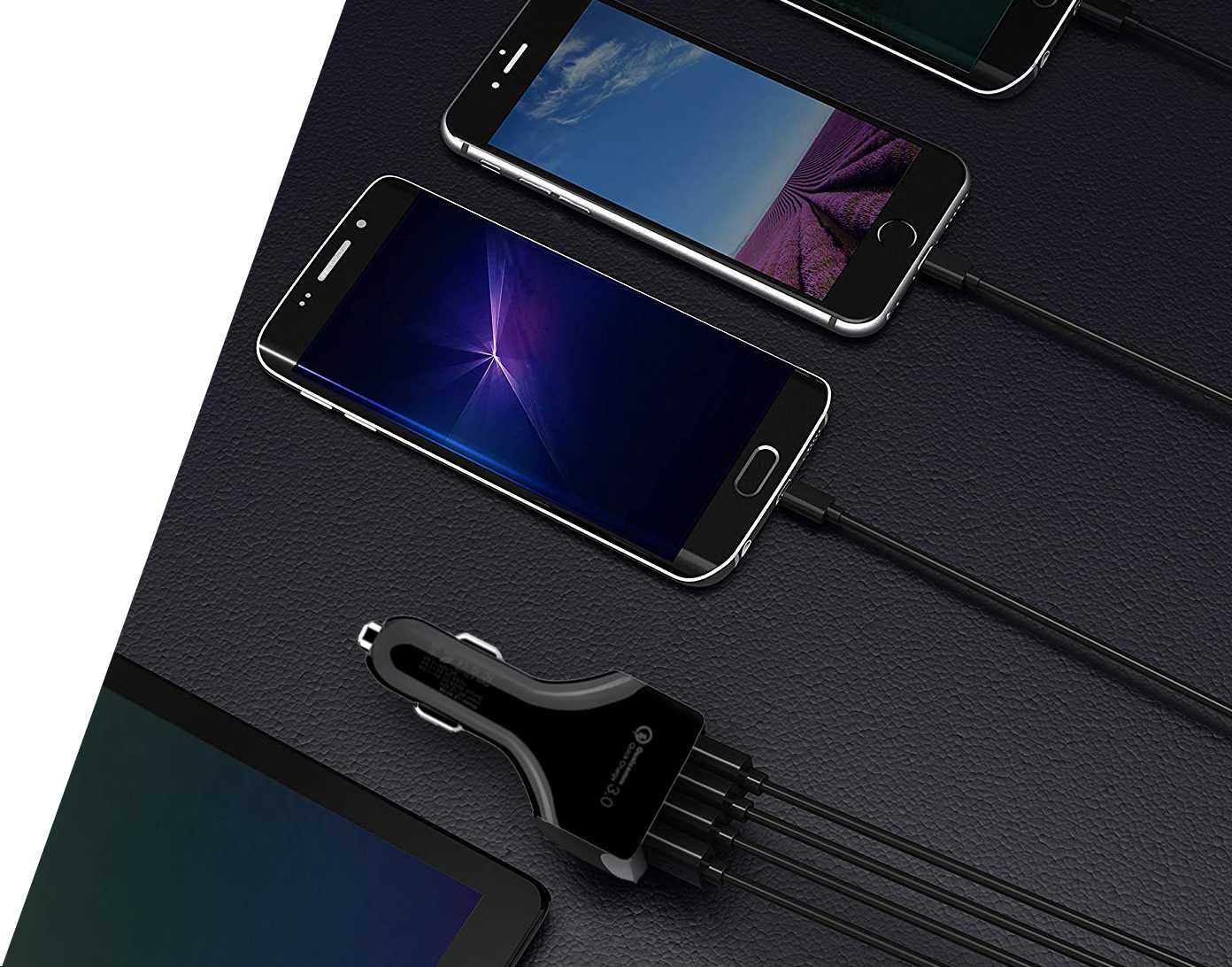 Irusu 7.0 Amp 4 port USB Car Charger Fast Charging with Qualcomm Quick Charger QC 3.0 for Apple and Android Devices.
